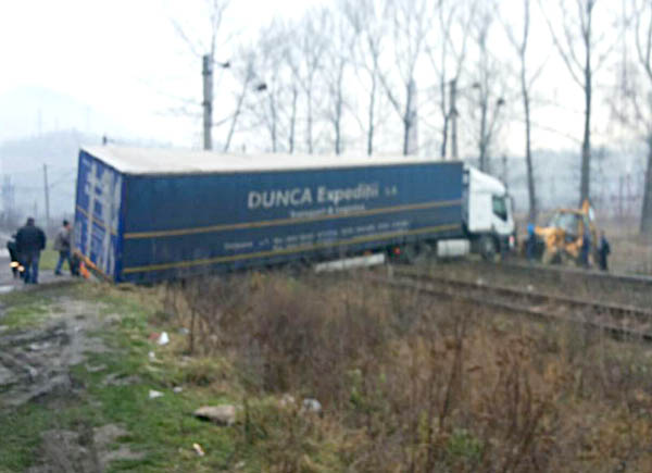 Evenimentul a avut loc sâmbătă dimineaţa, iar şoferul ar fi circulat cu viteză mult prea mare pe un drum industrial din Petroşani, paralel cu calea ferată. TIR-ul a intrat în derapaj, iar bărbatul aflat la volan nu l-a mai putut redresa şi a ajuns de-a curmezişul pe dubla de cale ferată. Din fericire, mastodontul a fost scos de pe şine înainte ca un tren să treacă prin zonă. Fiind vorba de blocarea traficului feroviar, ancheta în acest caz este efectuată de poliţiştii rutieri împreună cu cei de la Poliţia Transporturi Feroviare Petroşani.