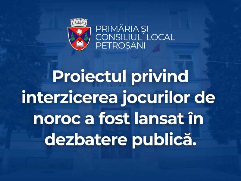 Primăria Petroşani a lansat, azi, în dezbatere publică un proiect de hotărâre prin care propune interzicerea jocurilor de noroc pe…