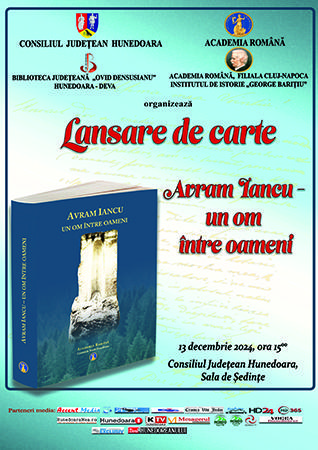 Biblioteca Județeană „Ovid Densusianu” Hunedora – Deva, cu sprijinul Consiliului Județean Hunedoara și în parteneriat cu Academia Română și Institutul de Istorie „George Barițiu” din Cluj-Napoca, organizează în 13 decembrie 2024, ora 1500, în Sala de Ședințe a Consiliului Județean Hunedoara, un eveniment cultural de excepție, de mare rezonanță patriotică: lansarea la Deva a volumului Avram Iancu – un om între oameni. Lucrările conferinței internaționale „Avram Iancu – 200 de ani de la naștere. Omul, contemporanii, epoca”, Deva, 10 – 11 mai 2024.