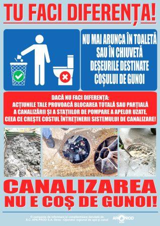 Compania de apă Apa Prod Deva reia campania ,,Canalizarea nu e coș de gunoi!” Aceasta se desfășoară în perioada 15 octombrie- 15 noiembrie 2023. Scopul campaniei este de a-i determina pe toți utilizatorii rețelei de canalizare să conștientizeze că utilizarea defectuoasă a acesteia cauzează înfundarea conductelor, iar apele uzate pot refula în locuințe sau pe domeniul public.