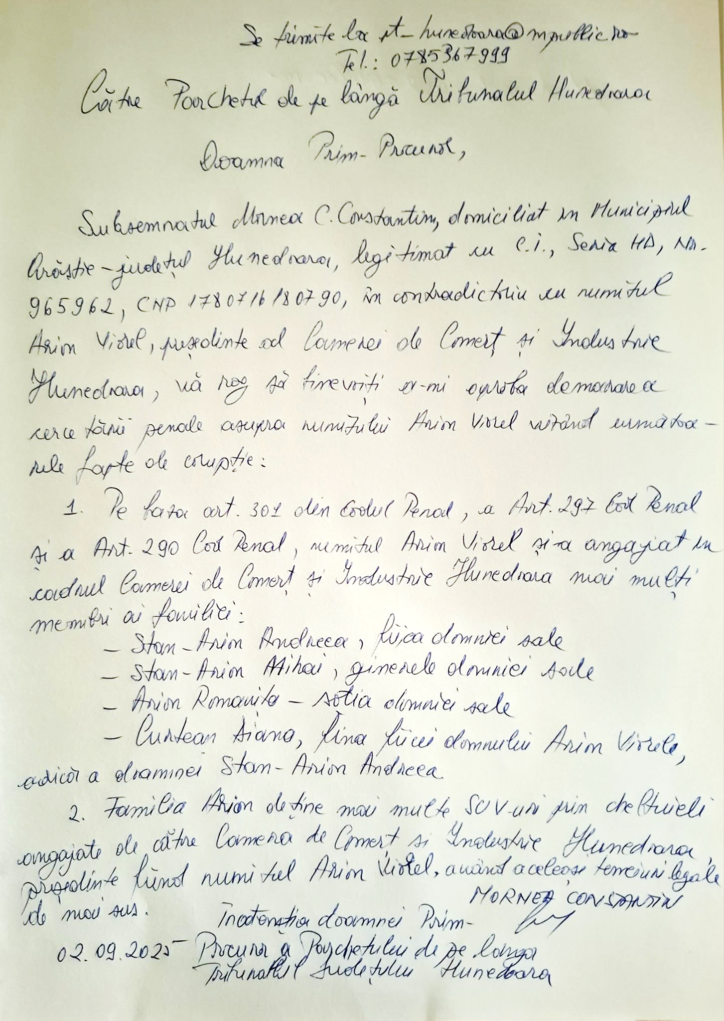 Am trimis o plângere către Prim-procurorul Parchetului de pe lângă Tribunalul Județului Hunedoara în care suspectez activitatea infracțională a președintelui Camerei de Comerț și Industrie Hunedoara”, susține Constantin Mornea. (A.N.)