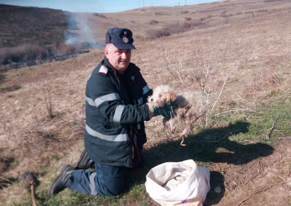 Căţel legat într-un sac, salvat din calea flăcărilor de un pompier