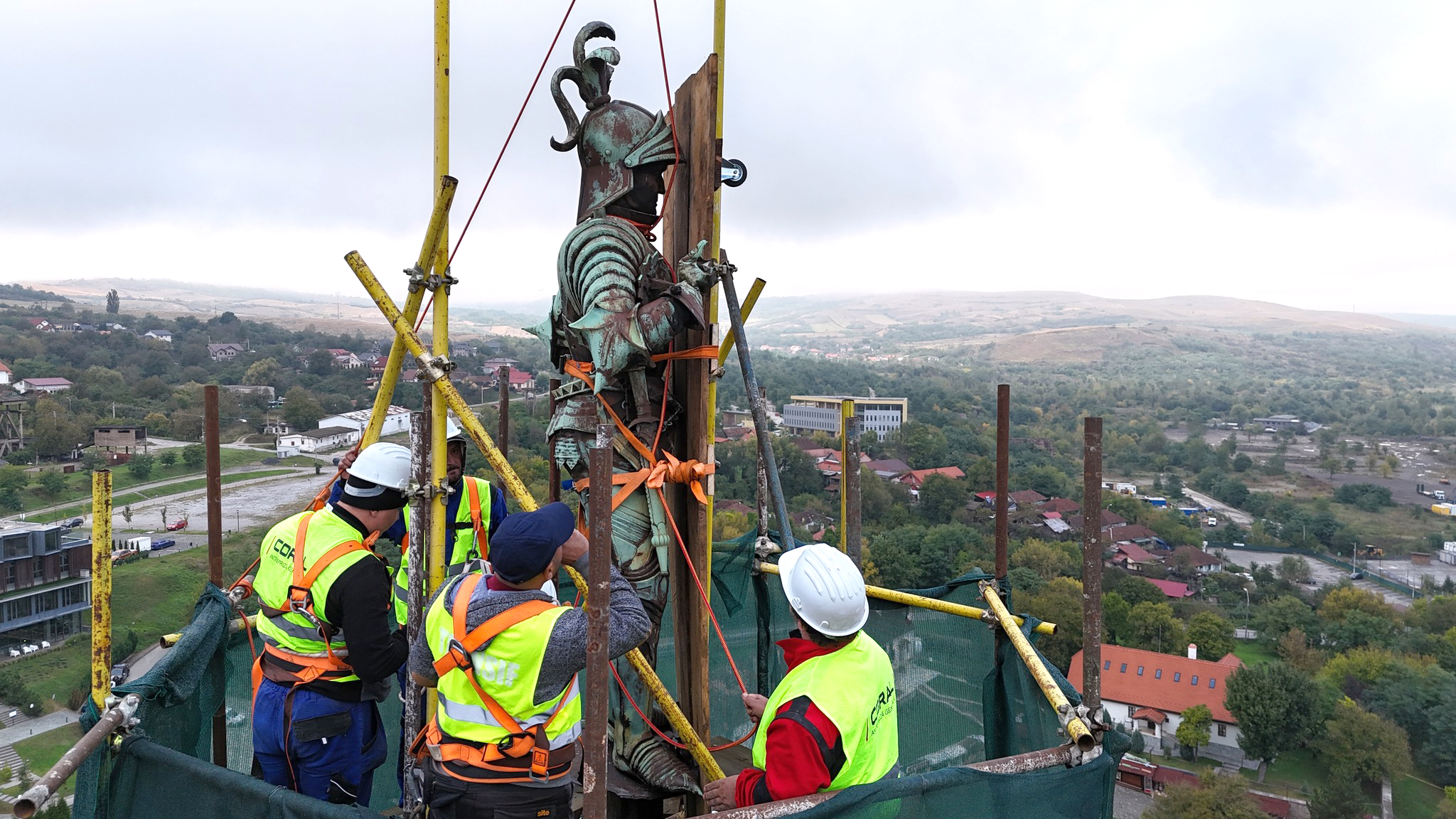 Pentru prima dată după 152 de ani, statuia care îl reprezintă pe Ioan (Iancu) de Hunedoara amplasată pe Turnul Buzdugan al Castelului Corvinilor a fost ieri demontată de pe suport şi coborâtă la sol.