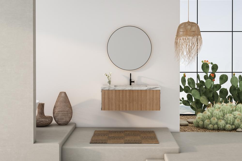 Alege materiale precum lemnul pentru a adăuga textură în mobilier sau accesorii și piatra pentru a crea suprafețe cu textură în jurul dușului sau al căzii. Integrează cu grijă ratanul în amenajarea băii Japandi pentru a-i scoate în evidență caracterul distinctiv, fiind important să găsești un echilibru pentru a evita un aspect demodat. Ratanul strălucește cel mai bine atunci când este folosit ca element de impact, așadar, este esențial să găsești o armonie în combinația de materiale și texturi.