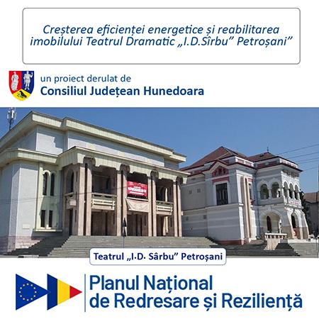 Clădirea în care funcţionează Teatrul Dramatic ”I.D. Sîrbu” din Petroşani va fi reabilitată din punct de vedere energetic cu fonduri în valoare de peste 2,6 milioane de euro, atrase de la Consiliul Judeţean (CJ) Hunedoara, prin Planul Naţional de Redresare şi Rezilienţă (PNRR).