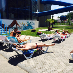 „Odată cu încălzirea timpului, vizitatorii noştri care doresc să se şi bronzeze în cadrul complexului o pot face pe o terasă recent amenajată în spatele unităţii. Am avut o astfel de terasă şi până acum, însă în acest an am decis să o înfrumuseţăm cu flori, şezlonguri şi un palmier, aşa încât oamenii să se simtă ca într-o adevărată staţiune. Capacitatea acesteia este de 40 de locuri iar cei care plătesc biletul de intrare au acces şi pe terasă“, a declarat administratorul Aqualand, Irinel Faur.