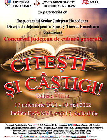 Biblioteca Județeană „Ovid Densusianu” Hunedoara-Deva, cu sprijinul Consiliului Județean Hunedoara și al Complexului Deva Mall, în parteneriat cu Inspectoratul Școlar Județean Hunedoara, Direcția Județeană pentru Sport și Tineret Hunedoara și cu ajutorul unor generoși sponsori organizează în ziua de 17 noiembrie 2021, ora 1300, în incinta Deva Mall, etajul trei, Salle d’Or, festivitatea de deschidere a celei de-a VIII-a ediții a Concursului județean de cultură generală „Citești și câștigi!”, când se vor trage la sorți grupele.