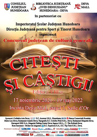 Biblioteca Județeană „Ovid Densusianu” Hunedoara-Deva, cu sprijinul Consiliului Județean Hunedoara și al Complexului Deva Mall, în parteneriat cu Inspectoratul Școlar Județean Hunedoara, Direcția Județeană pentru Sport și Tineret Hunedoara și cu ajutorul unor generoși sponsori organizează în ziua de 17 noiembrie 2021, ora 1300, în incinta Deva Mall, etajul trei, Salle d’Or, festivitatea de deschidere a celei de-a VIII-a ediții a Concursului județean de cultură generală „Citești și câștigi!”, când se vor trage la sorți grupele.