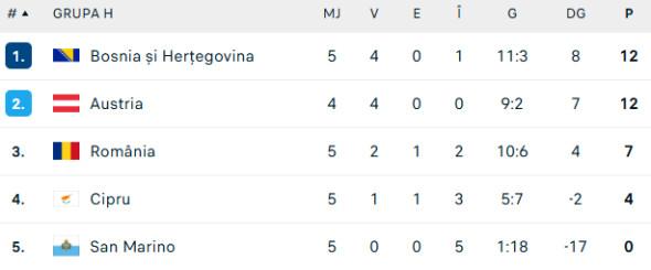 În acest moment, cu trei meciuri rămase de jucat, România este pe locul al treilea în grupă, cu 7 puncte, la cinci lungimi de primele două locuri pe care se află Austria și Bosnia.