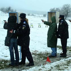 Concursul de tir s-a desfăşurat în poligonul Mintia şi a constat în executarea a două trageri la ţintă, cu pistolul model 1974, calibrul 7,65, asupra unui obiectiv fix, situat la 15 metri distanţă faţă de concurenţi. Pe un frig năprasnic şi un vânt nervos, participanţii au trecut rând pe rând în faţa ţintei care urma a fi „răpusă” de gloanţe. Executarea primei trageri a avut drept scop acomodarea concurenţilor cu armamentul, dar calificativul obţinut nu a fost luat în calcul la stabilirea clasamentului final.