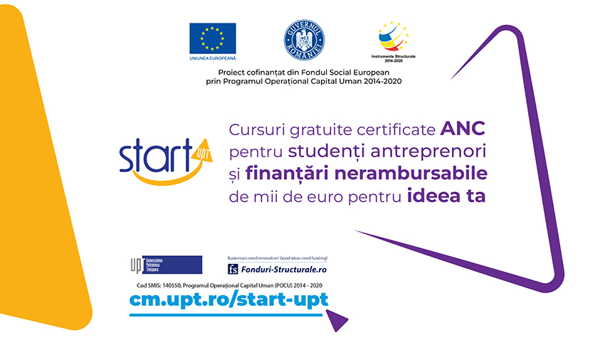 Află mai multe detalii despre cursurile GRATUITE de antreprenoriat certificate ANC și modalitățile de finanțare nerambursabilă pentru studenți la următoarea adresă: https://www.cm.upt.ro/lansare-start-upt/