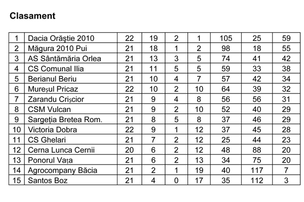 Dacia Orăştie a câştigat derbiul rundei, trecând cu 4-2 de AS Sântămăria Orlea, după ce la pauză scorul era egal, 1-1. Măgura Pui s-a impus fără problemă pe terenul lui CS Ghelari, cu câte un gol marcat în fiecare repriză de Albesc. CS Comunal Ilia a rămas pe locul 4 în clasament, după remiza de la Vaţa, scor 2-2, obţinută în finalul partidei.