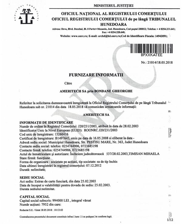 Calitatea de cenzor supleant la SC Ameritech SA, companie cu capital privat, la care ANI face referire cum că ar determina incompatibilitatea senatoarei, a fost exercitată de Carmen Hărău în perioada 02.10 2006-02.10.2009, aşa cum rezultă, de altfel, din adresa de FURNIZARE INFORMAŢII emisă la cerere, cu Nr.21014/18.05.2018, de către Oficiul Naţional al Registrului Comerţului de pe lângă Tribunalul Hunedoara. (vezi anexa-extras din document)