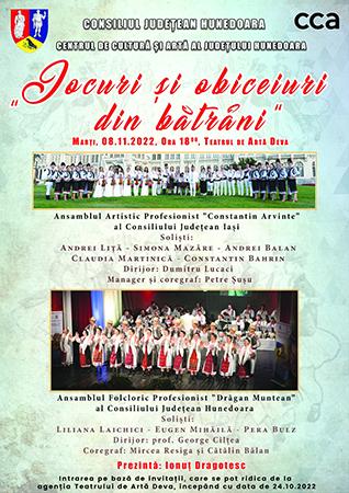 Consiliul Judeţean Hunedoara și Centrul de Cultură şi Artă al judeţului Hunedoara vă invită în data de 8 noiembrie 2022, începând cu ora 18:00, la Teatrul de Artă din Deva pentru a vă bucura de spectacolul „Jocuri și obiceiuri din bătrâni”.
