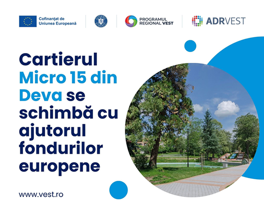 O suprafață de peste 70.000 de metri pătrați va fi revitalizată în urma proiectului finanțat prin Programul Regional Vest. Vor fi create zone pietonale, extinse spațiile verzi, bicicliștii vor beneficia de piste noi, iar copiii – de locuri de joacă moderne. Contractul de finanțare pentru proiectul „Regenerarea urbană a zonei Micro 15” a fost semnat de reprezentanții ADR Vest și cei ai Primăriei Municipiului Deva.