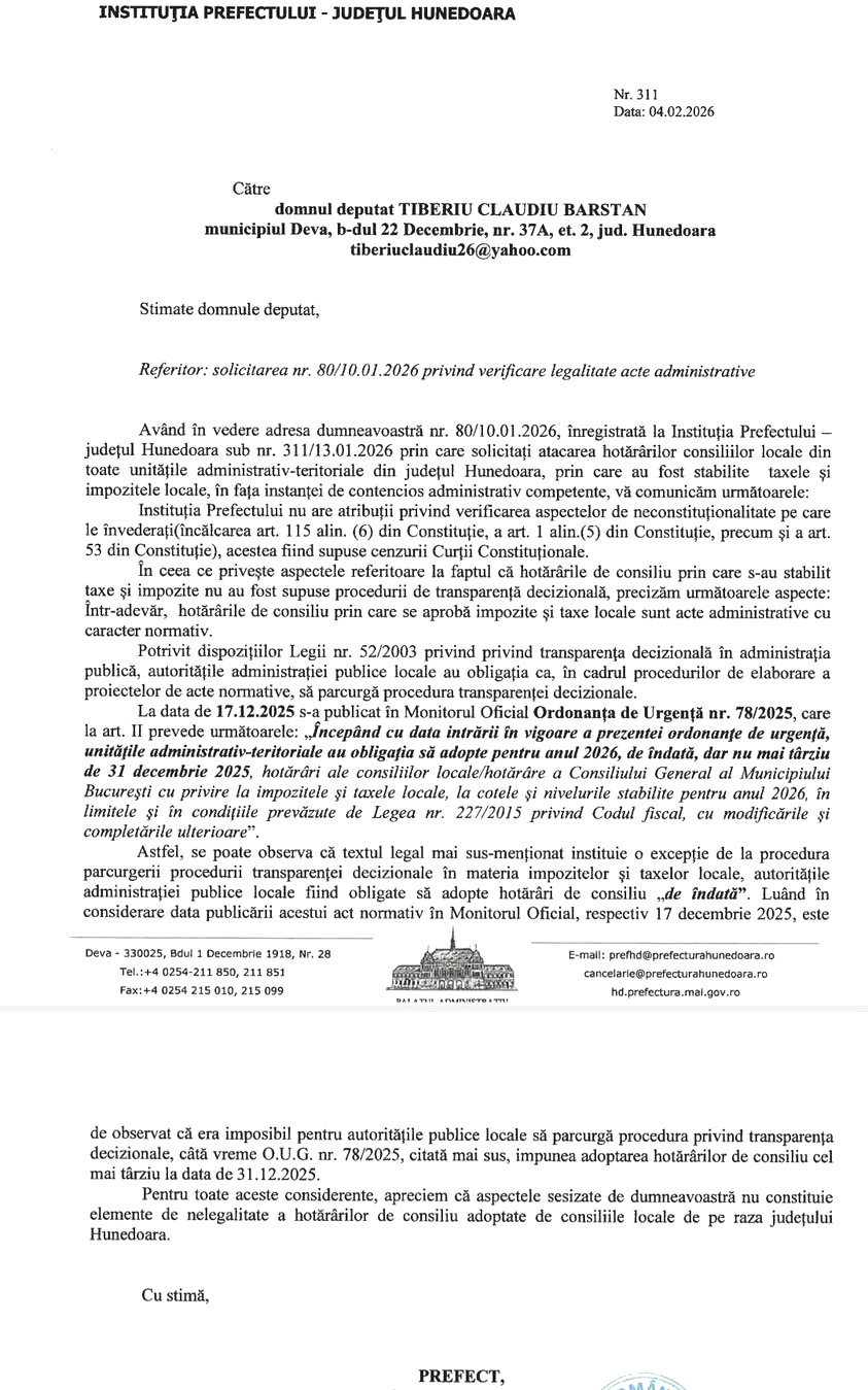 Instituția Prefectului Județului Hunedoara mi-a transmis un răspuns oficial la sesizarea privind legalitatea hotărârilor de consiliu local referitoare la taxele și impozitele pentru anul 2026, precum și la solicitarea de a le ataca în instanță, la Tribunalul Hunedoara.