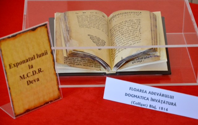 Exponatul lunii aprilie face parte din colecţia de carte veche a MCDR, fiind reprezentat de un colligat, ce conține veritabile mostre de literatură bisericească originală. Practic este vorba despre două cărți legate împreună ce au fost reeditate la Blaj, în anul 1816. Primul volum, „Floarea adevărului pentru pacea şi dragostea de obşte”, publicat inițial în 1750, este o lucrare realizată de vicarul Petru Pavel Aron şi de călugării erudiţi stabiliţi în Mănăstirea Sfânta Treime din Blaj. Cel de-al doilea, intitulat „Păstorniceasca poslanie” sau „Dogmatica învăţătură a Besearicii răsăritului” a fost scrisă tot de Petru Pavel Aron şi a fost imprimată în acelaşi centru tipografic la 1760.