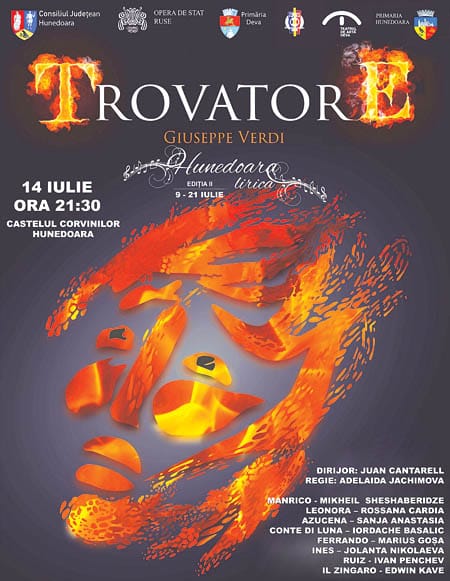Aşadar, sâmbătă, 14 iulie, începând cu ora 21.30, la Castelul Corvinilor din municipiul Hunedoara, se va juca „Trubadurul“, operă în patru acte, pe muzica lui Verdi şi un libret de Salvatore Cammarano, inspirat din tragedia „El trovator“ de Antonio Garcia Gutiérrez, spectacolul fiind susţinut de Opera de Stat din Ruse (Bulgaria). Distribuţia în roluri este următoarea: Manrico – MIKHEIL SHESHABERIDZE (Estonia), Leonora – ROSSANA CARDIA (Italia), Azucena – SANJA ANASTASIA (Serbia), Conte di Luna – IORDACHE BASALIC (România), Ferrando – MARIUS GOŞA (România), Ines – JOLANTA NIKOLAEVA (Bulgaria), Ruiz – IVAN PENCHEV (Bulgaria), Il zingaro – EDWIN KAVE (Bulgaria), Dirijor: JUAN CANTARELL (Spania), Regie: ADELAIDA JACHIMOVA (Bulgaria). Preţul unui bilet este de 30 de lei, iar durata spectacolului va fi de două ore şi 40 de minute, cu pauză între acte.