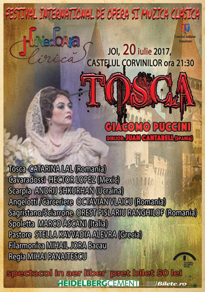 Soprana Catarina Lal, fiica scriitorului Romulus Lal, cu originile în judeţul Hunedoara, descrisă de presa germană drept „o Toscă de o pasiune năvalnică” (Hamburger Abendblatt), vine să interpreteze acest rol pentru prima oară în România, revenind la Castelul Corvinilor după o absenţă de cinci ani, ea interpretând aici în 2011 rolul Violettei Valery în Traviata. Stabilită din 1998 la Viena, solista este recunoscută cel mai târziu după debutul în premieră mondială a operei “Der Marylin Monroe Prozess” de Roland Baumgartner, drept una dintre „cele mai talentate soprano dramatice ale prezentului” (Elmar Leimgruber). Cu apariţii în roluri precum Lady Macbeth, Violetta Valery, Donna Anna ş.a. Soprano Catarina Lal duce mai departe bogata tradiţie a solistelor românce de operă, din Europa în Asia, din America de Sud până în Rusia, cu toatea acestea declarând că „abia pe valea Geoagiului începe să respire!”