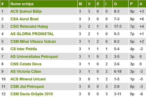 Lider după trei etape este Şoimul Băiţa, care totalizează 9 puncte ca şi Aurul Brad, dar are golaveraj mai bun.