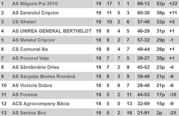 Liderul actual al clasamentului, Măgura Pui, cu victoria de duminică (4-2 acasă cu echipa din Bretea Română) şi-a mărit avansul la 14 puncte faţă de a doua clasată, Zarandul Crişcior, şi mai are nevoie de un singur punct pentru a deveni câştigătoarea campionatului.
