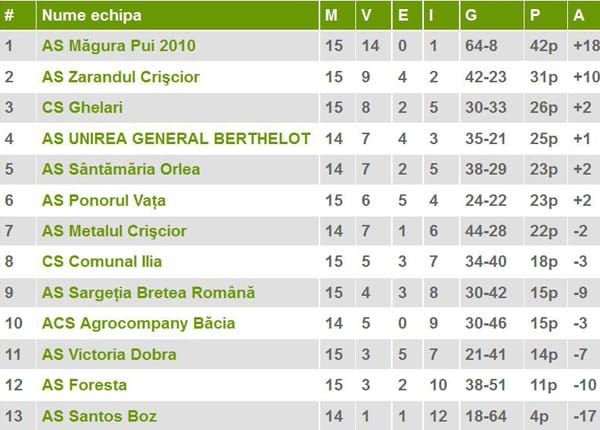 Gazdele îşi continuă fără probleme parcursul şi se menţin pe locul I în clasament şi după această rundă, în care au câştigat lejer cu 5-0 partida de pe teren propriu, disputată în compania celor de la Zarandul Crişcior, echipă aflată pe locul al doilea, dar fără posibilitatea de a mai reduce din diferenţa pe care liderul o are acum.