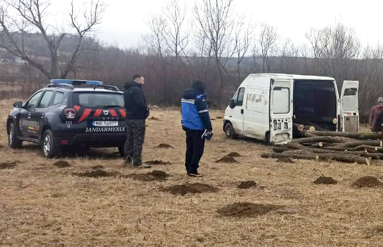 În aceeaşi zi, jandarmii montani din Pui au fost sesizaţi că două persoane transportă material lemnos în zona lizierii pădurii din localitatea Ruşor, comuna Pui. Militarii au mers împreună cu un pădurar în zona indicată, unde au găsit două persoane cu o camionetă şi un atelaj hipo încărcate cu material lemnos. În urma verificărilor efectuate s-a constatat că erau trunchiuri de copaci tăiaţi ilegal, de pe o proprietate care nu le aparţinea celor doi.