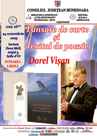 Biblioteca Județeană „Ovid Densusianu” Hunedoara – Deva, cu sprijinul Consiliului Județean Hunedoara și în parteneriat cu Editura Școala Ardeleană din Cluj-Napoca, organizează în 24 octombrie 2025, ora 1600, în incinta Deva Mall, etajul trei, Salle d’Or, în cadrul Salonului Hunedorean al Cărții, ediția a XXIV-a, o întâlnire cu maestrul Dorel VIȘAN, care își va prezenta două dintre cărțile sale: „Cine-i păzește pe paznici? Gânduri de zi și de noapte” și „Cântece pentru glas și toacă”, ambele apărute la Editura Școala Ardeleană din Cluj-Napoca. Cu această ocazie, maestrul va susține și un recital de poezie.