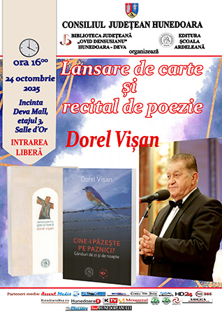 Biblioteca Județeană „Ovid Densusianu” Hunedoara – Deva, cu sprijinul Consiliului Județean Hunedoara și în parteneriat cu Editura Școala Ardeleană din Cluj-Napoca, organizează în 24 octombrie 2025, ora 1600, în incinta Deva Mall, etajul trei, Salle d’Or, în cadrul Salonului Hunedorean al Cărții, ediția a XXIV-a, o întâlnire cu maestrul Dorel VIȘAN, care își va prezenta două dintre cărțile sale: „Cine-i păzește pe paznici? Gânduri de zi și de noapte” și „Cântece pentru glas și toacă”, ambele apărute la Editura Școala Ardeleană din Cluj-Napoca. Cu această ocazie, maestrul va susține și un recital de poezie.