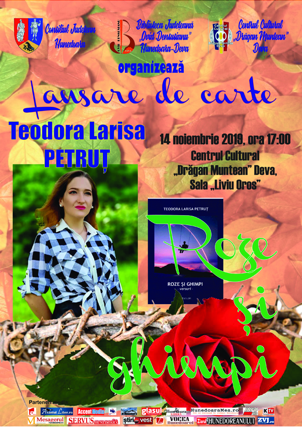 Biblioteca Judeţeană „Ovid Densusianu” Hunedoara-Deva, cu sprijinul Consiliului Judeţean Hunedoara, organizează în ziua de 14 noiembrie 2019, ora 17.00, la Centrul Cultural „Drăgan Muntean” din Deva, Sala „Liviu Oros”, lansarea volumului de versuri „Roze şi ghimpi” al tinerei Teodora Larisa Petruţ, elevă în clasa a XII-a a Liceului de Arte „Sigismund Toduţă” din Deva.