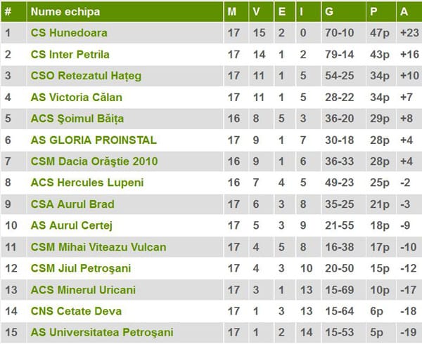 Liderul CS Hunedoara a evoluat în deplasare, pe terenul celor de la CSM Vulcan, unde a pornit cu prima şansă, dar pe teren lucrurile au stat altfel. Hunedorenii au deschis scorul la mijlocul primei reprize şi lucrurile păreau să intre în normal, dar, cu cinci minute înainte de pauză, gazdele au restabilit egalitatea. Această egalitate a durat până în minutul 83, când a înscris Simionov şi, astfel, a adus victoria pentru cei de la CS Hunedoara, cu scorul de 2-1. Elevii pregătiţi de Mircea Alic jr. rămân pe locul I, cu un total de 47 de puncte, iar formaţia din Vulcan rămâne pe locul 11, cu 17 puncte. Pe locul al doilea, la patru puncte de CS Hunedoara, ecartul fiind păstrat, rămâne Inter Petrila, care nu a avut nici un fel de probleme în meciul cu CNS Cetate Deva (6 puncte), câştigând, acasă, cu 6-0, scorul etapei, într-un meci în care Matei a reuşit un hatt-trick, iar Kallai a marcat două goluri.