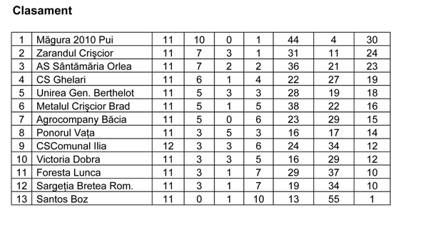 Trupa din Pui a întâlnit în ultima rundă, într-un derbi al zonei, pe Unirea General Berthelot. Gazdele s-au impus clar, scor 4-1, golgheterul liderului, Ionuţ Lupulescu, reuşind o „triplă”. Chiar dacă Măgura a jucat mai bine de jumătate de oră cu un om în minus, victoria nu a fost pusă la îndoială. Ocupanta locului secund, Zarandul Crişcior, a remizat pe terenul celor de la CS Comunal Ilia, scor 3-3, gazdele marcând golul egalizator în al patrulea minut de prelungire, prin Moga. Tot o remiză a înregistrat şi AS Sântămăria Orlea, echipa de pe ultima treaptă a podiumului. Trupa lui Silviu Oneasă nu a fost departe de o înfrângere în faţa Victoriei Dobra, care a condus prin golul lui Bodea, dar căpitanul gazdelor, Marian Tomoni, a înscris golul egalării cu opt minute înainte de final.