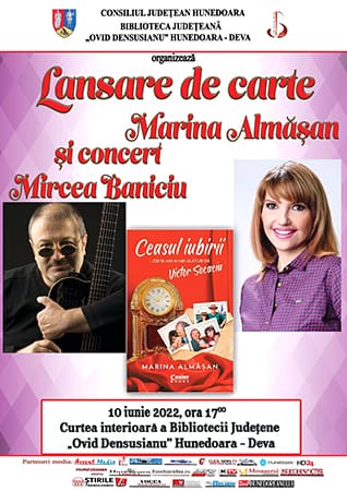 Biblioteca Județeană „Ovid Densusianu” Hunedoara – Deva, cu sprijinul Consiliului Județean Hunedoara, organizează în 10 iunie 2022, ora 1700, în curtea interioară a instituției, lansarea cărții Marinei Almășan. Este vorba de „Ceasul iubirii… Cei 16 ani ai mei alături de Victor Socaciu”, apărută la Editura Corint Books.