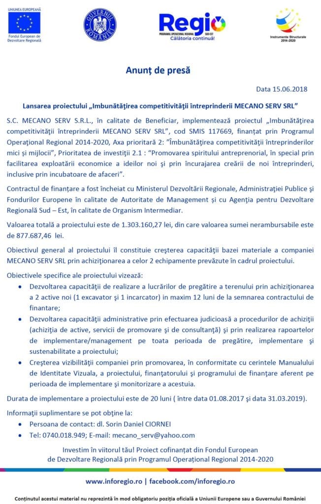 Mecano Serv SRL – Anunț de presă