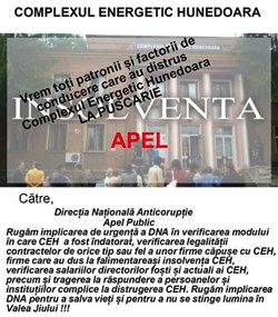 „Rugăm implicarea DNA pentru a salva vieţi şi pentru a nu stinge lumina în Valea Jiului”, se mai arată în apelul făcut către Parchetul Anticorupţie. Consiliul de Administraţie al Complexului Energetic Hunedoara a decis pe 28 decembrie să ceară intrarea voluntară a companiei în insolvenţă, în încercarea de a evita falimentul, lucru care s-a şi întâmplat în ianuarie a.c. Compania are datorii de 1,2 miliarde de lei şi popriri pe toate conturile. Complexul Hunedoara este cel mai scump producător de energie din România, cu un preţ de producţie al energiei electrice de peste 300 de lei/MWh, de două ori mai mare decât tariful mediu de vânzare de pe piaţă. La CEH lucrează circa 6.300 de angajaţi la minele de cărbune Lupeni, Lonea, Livezeni şi Vulcan şi la termocentralele Mintia şi Paroşeni, iar compania deţine o cotă de piaţă de aproximativ 5 la sută din producţia de energie electrică din România.