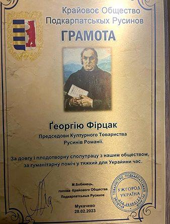Societatea Regională a Rutenilor din Podkarpatska, prin președintele Mikola Bobineț, mulțumește Uniunii Culturale a Rutenilor din România, președintelui Gheorghe Firczak, pentru ajutoarele umanitare duse în Ucraina în momente grele pentru această țară. Diploma a fost emisă la Munkacevo/Podkarpatska Rus, Ucraina la 28.02.2023.