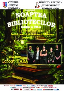 Momentul muzical al serii va fi susţinut de cunoscuta şi îndrăgita trupă pop-rock HARA, care va veni în faţa publicului cu piesele cele mai cunoscute. După spectaculosul foc de artificii, oaspeţii vor fi invitaţi să viziteze secţiile bibliotecii. De asemenea, cei prezenţi vor fi apoi invitaţi la Sala de Lectură şi în curtea instituţiei pentru a viziona filme cu tematică thriller şi suspans. Se vor putea vizita expoziţiile pe care Biblioteca le-a pregătit special pentru oaspeţi: „Noaptea Bibliotecilor, an de an…” şi expoziţia interactivă de jocuri a Muzeului Jocurilor din Chemnitz, Germania.