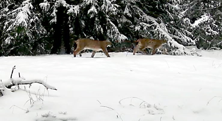 În imaginile video se poate observa cum femela traversează prima o porţiune dintr-un luminiş, iar după câteva secunde este urmată de cei doi pui, prin zăpadă.