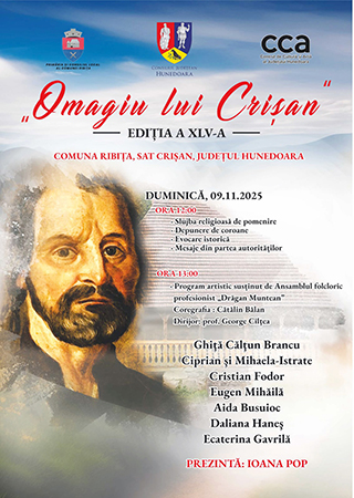 Duminică, 9 noiembrie 2025, sunteți așteptați să-i aduceți un Omagiu lui Crișan, în cadrul unui eveniment ajuns la ediția cu numărul XLV și dedicat personalității istorice şi jertfei unuia dintre conducătorii Răscoalei de la 1784, Gheorghe Crişan. Organizarea e semnată de Consiliul Județean Hunedoara, Centrul de Cultură și Artă al Județului Hunedoara și administrația publică locală din Ribița.