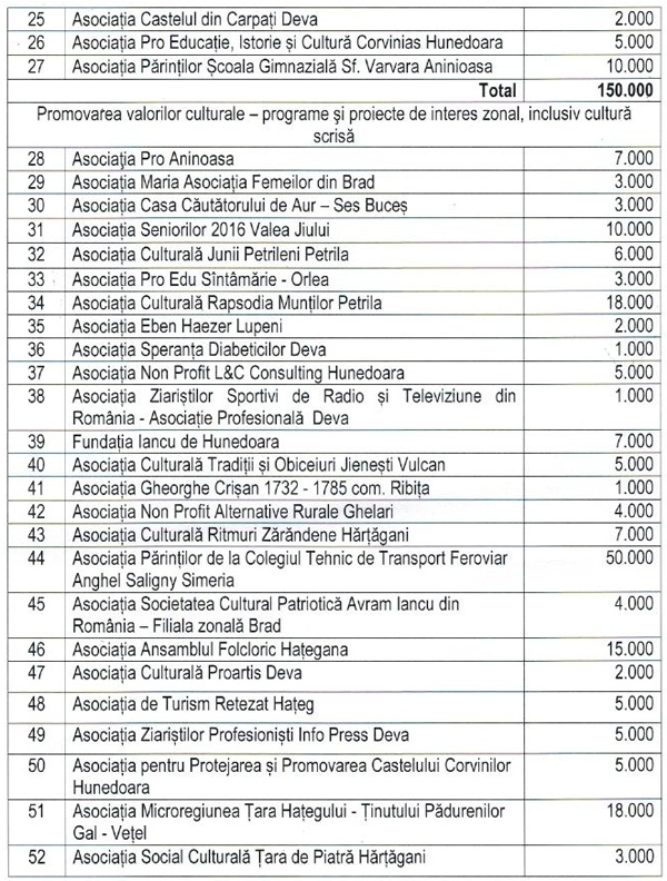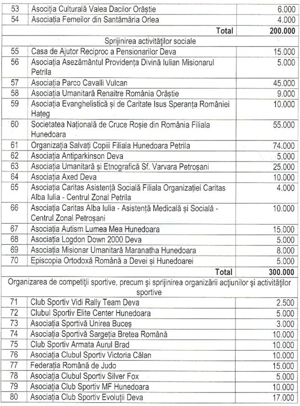 Conform anexei proiectului de hotărâre, la capitolul activităţilor dedicate tinerilor vor fi susţinute financiar 27 de proiecte din 30 depuse. Cea mai mare sumă a fost alocată Asociaţiei Club Sportiv Masters Sports Sîntămăria Orlea – 20.000 de lei. Celelalte 26 de organizaţii vor primi sume cuprinse între 1.500 şi 12.000 de lei, bugetul total fiind de 150.000 de lei. Un alt domeniu sprijinit de CJ Hunedoara este cel al promovării valorilor culturale. Aici, vor fi finanţate 27 de proiecte din 44 depuse. Cea mai mare sumă, 50.000 de lei, o va primi proiectul Asociaţiei Părinţilor de la Colegiul Tehnic de Transport Feroviar Anghel Saligny Simeria, pentru celelalte proiecte fiind alocate sume între 1.000 şi 18.000 de lei. Bugetul total la acest capitol este de 200.000 de lei. În domeniul activităţilor sociale, 16 asociaţii vor beneficia de finanţare în valoare totală de 300.000 de lei. Dintre cele 43 de proiecte întocmite de entităţile care desfăşoară activităţi sportive, 37 vor fi sprijinite financiar de administraţia judeţului. Cei mai mulţi bani au fost atribuiţi proiectului întocmit de Clubul Sportiv CFR Simeria, 70.000 de lei, celelalte proiecte având la dispoziţie între 1.000 şi 50.000 de lei fiecare. Bugetul total alocat activităţilor sportive este de 500.000 de lei.