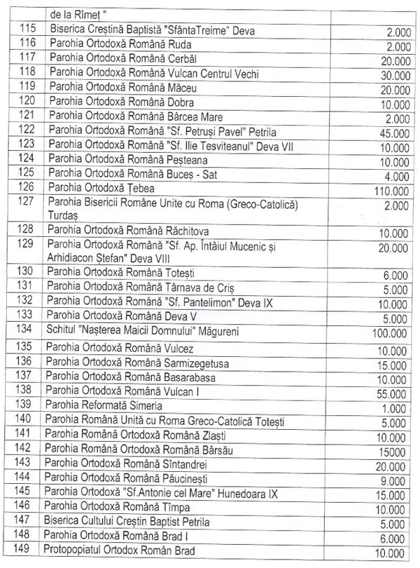 Pentru sprijinirea cultelor religioase, CJ Hunedoara a alocat suma de 1.350.000 de lei, bani care vor fi împărţiţi de 109 parohii şi biserici de la toate cultele din judeţ. Cea mai mare sumă a fost alocată Parohiei Ortodoxe Ţebea, respectiv 110.000 de lei, celelalte entităţi religioase urmând să beneficieze de sume cuprinse între 1.000 şi 100.000 de lei.