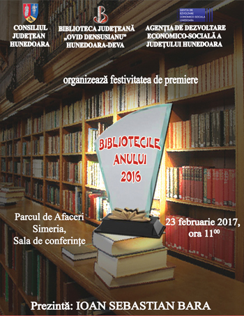 În 23 februarie, Biblioteca Judeţeană „Ovid Densusianu” Deva organizează în Sala de conferinţe a Parcului de Afaceri din Simeria, un eveniment deosebit de important în viaţa bibliotecilor publice din judeţ. Este vorba de festivitatea de premiere a bibliotecilor publice care au excelat în activitate.