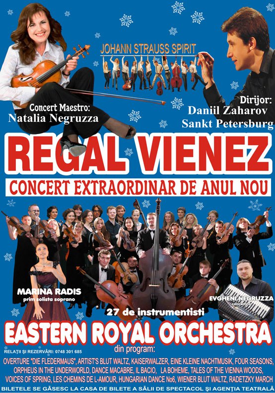 Orchestra internaţională, compusă din 27 de instrumentişti de prima clasă, este condusă de dirijorul, Daniil Zaharov şi concert- maestro Natalia Negruzza. Din ansamblu mai fac parte binecunoscutul acordeonist Evgheni Negruzza, care beneficiază de drepturile de autor acordate personal de Richard Galiano, acordeonistul numărul 1 al lumii, şi faimoasa soprană Marina Raddis, prim solistă a Operei Naţionale din Chişinău. Cei prezenţi la concert vor asculta celebrele valsuri vieneze ale dinastiei Strauss, vor fi purtaţi pe ritmurile “ Dunării Albastre”, ce vor fi transpuse în paşi de dans de trupa de balet care însoţeşte orchestra.