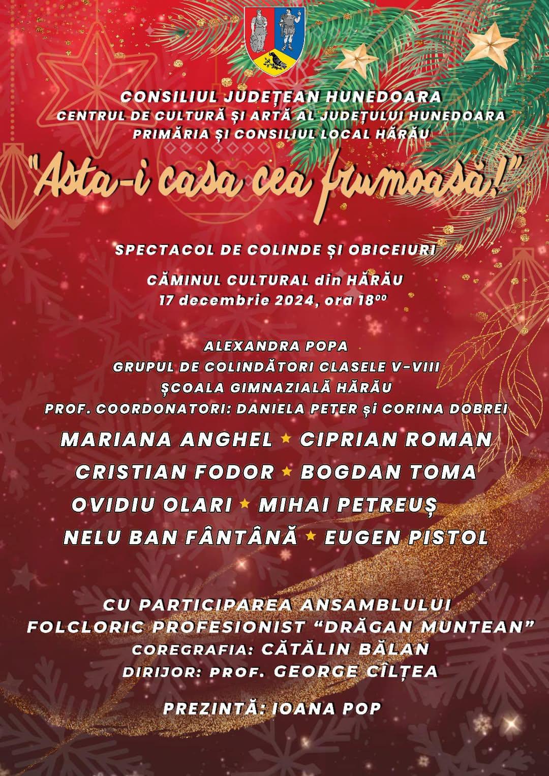 „Mâine, 17 decembrie 2024, în­ce­pând cu ora 18:00, la Căminul Cultural din Hărău, vă invit să ne bucurăm îm­preună de magia și frumusețea Săr­bătorii Nașterii Domnului, prin colinde și obiceiuri tradiționale românești, în ca­drul unui spectacol ce pune în va­loa­re fru­musețea și autenticitatea tra­di­ți­i­lor noas­tre strămoșești. Vă aștept să co­lindăm împreună, într-o atmosferă ma­gică de sărbătoare!“, a fost invitaţia lan­sată de Lucian Michael Albu Weber (foto).