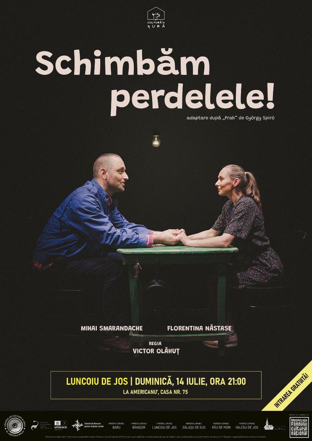 „Duminică, 14 iulie 2024, de la ora 21:00, vă așteptăm la șura din gospodăria doamnei Benea Natalia Maria, nr. de casă 75, zisă și La Americanu’, din localitatea Luncoiu de Jos, unde se va juca piesa de teatru Schimbăm perdelele!. Vrem să ne bucurăm de ceva inedit, ce nu se întâmplă prea des în comunele hunedorene și nu numai. Cred că diversitatea e ceva ce cu toții ne dorim, iar o piesă de teatru e ca o gură de aer rece într-o vară toridă. Haideți să petrecem împreună o seară reușită! Ne mai descrețim frunțile”, a fost invitația lansată de primarul din Luncoiu de Jos, Călin Dud (foto). Trebuie menționat că demersul face parte dintr-un proiect intitulat Cultură’n Șură, demarat în anul 2013, la inițiativa regizorului Victor Olăhuț, de către o asociație din București. Are finanțare de la Administrația Fondului Cultural Național, iar conceptul este de a juca cât mai aproape de oameni, dacă se poate în curțile lor. Se derulează vara, când actorii de teatre naționale nu au stagiune, putând face deplasări prin țară.