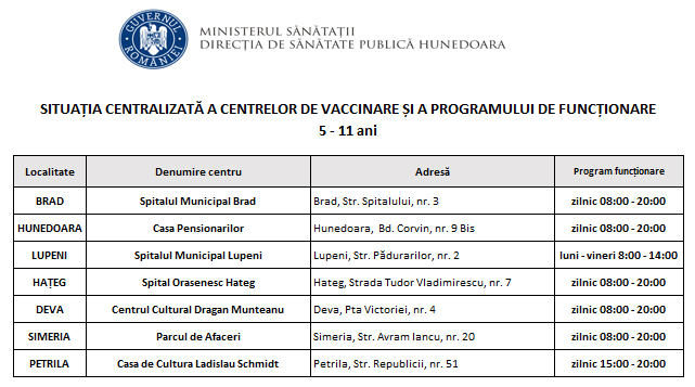 Centrele de vaccinare și personalul vaccinator sunt pregătite să înceapă să-I imunizeze pe cei mici. Programarea copiilor cu vârstele între 5 și 11 ani se poate realiza numai în centrele de vaccinare regăsite în platformă cu denumirea P_Ped, prin intermediul conturilor părinților sau ale reprezentanților legali. Vaccinarea se poate realiza și fără programare, prin prezentare directă în cabinetele centrelor de vaccinare dedicate copiilor sau în cabinetele medicilor de familie care au solicitat doze pediatrice, pe tot parcursul programului de lucru. Iată lista centrelor pentru copii: