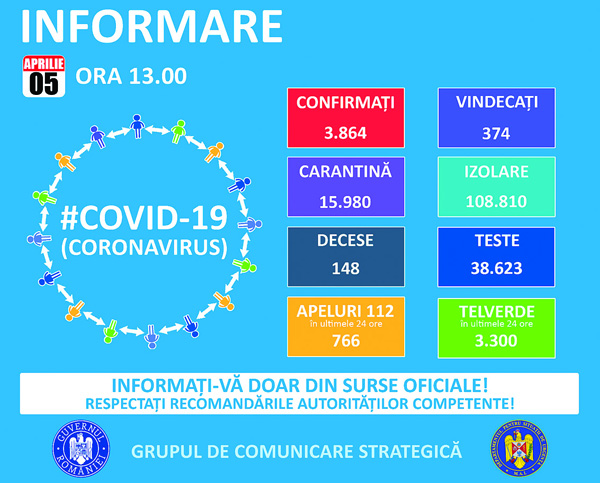În ce priveşte situaţia la nivel naţional, până duminică, 5 aprilie, ora 12.00, pe teritoriul României, au fost confirmate 3.864 de cazuri de persoane infectate cu virusul COVID – 19 (coronavirus). Dintre persoanele confirmate pozitiv, 374 au fost declarate vindecate şi externate.