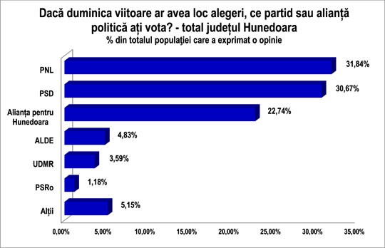 Pe locul al doilea, în topul preferinţelor alegătorilor, se află PSD cu 30,67%, urmat de alianţa civică nou înfiinţată Alianţa pentru Hunedoara, cu un procent de 22,74 la sută.