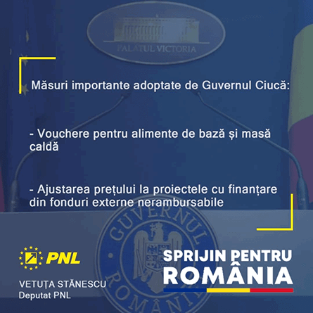 în valoare de 250 lei. Voucherele vor fi acordate începând cu data de 1 iunie, o dată la două luni. De această măsură de sprijin vor beneficia aproximativ 3 milioane de oameni, valoarea totală a proiectului fiind de peste 3 miliarde de lei, din care jumătate sunt fonduri europene.