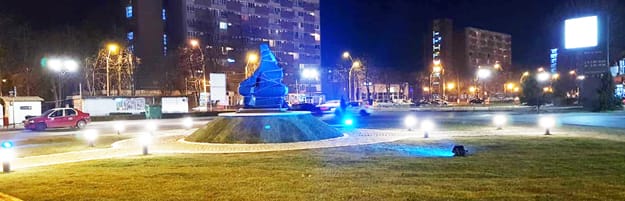 Statuia lui Mişa Klein, luminată în culorile Corvinului